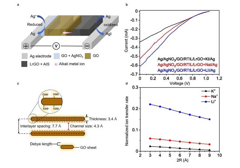 -1扫速下的I-V特征图(25℃ RH 80%)。c,GO纳米流体通道及其尺寸的示意图。d,建模模拟脱水状态的裸碱金属离子在亚纳米孔中的传输特性(σ = 0.06 C m