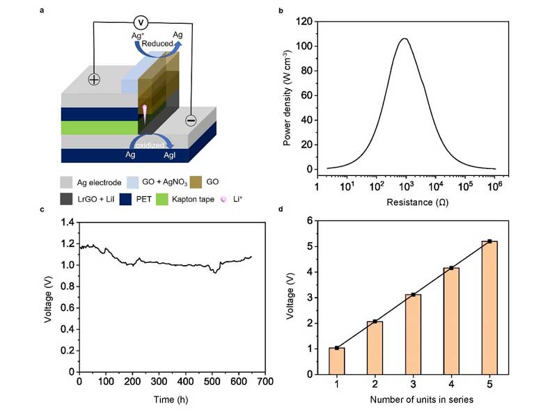 图4. 垂直结构离子电子学储能器件的特征。a,器件结构示意图。b,器件以电子负载电阻为参数的体功率密度图。c,器件在北京地区大气环境下(23-23.6℃, RH 12.1-20%)的开路电压性能。d,器件的串联电压输出性能(25 °C RH 80%)。