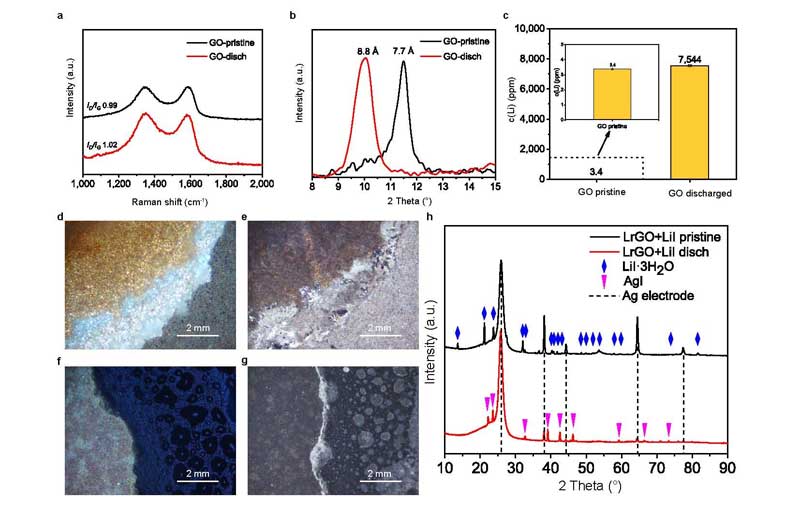 3/GO边界的显微光学图片(25℃ RH 80%)。f,g,器件放电前(d)后(e)负极侧Ag electrode/LrGO+LiI边界的显微光学图片(25℃ RH 80%)。h,器件放电前后负极侧XRD特征图表明器件放电后负极有AgI生成。