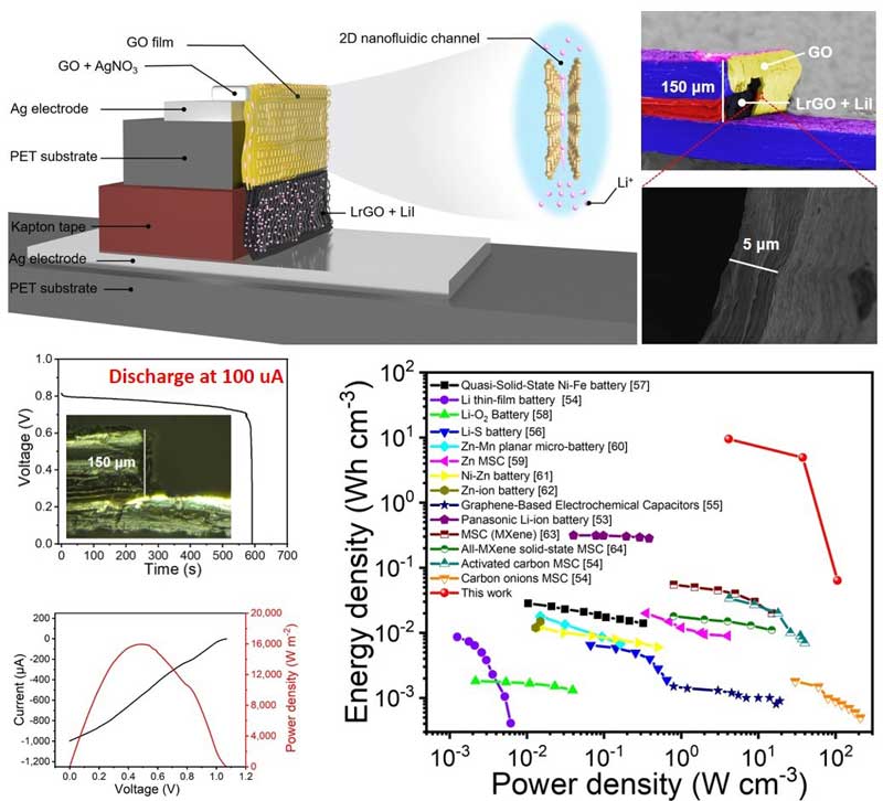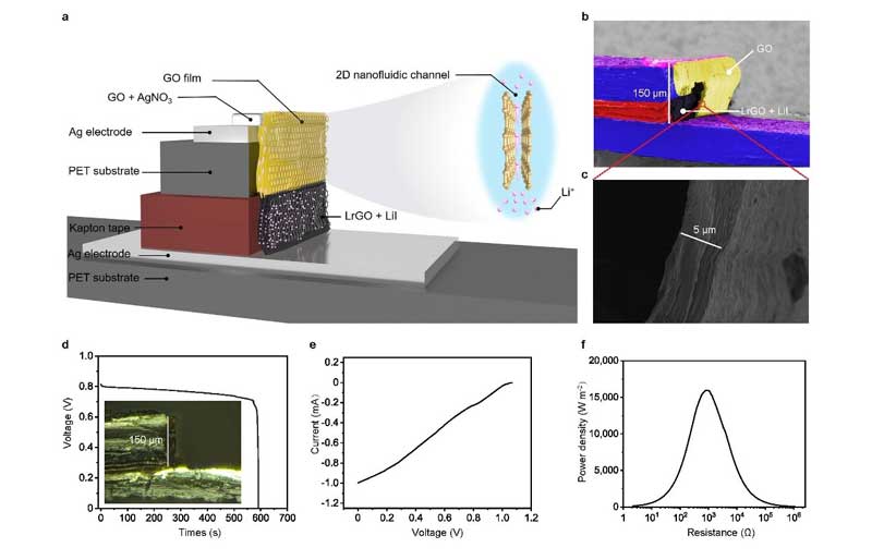 图1. 垂直结构离子电子学储能器件。a,器件垂直结构和锂离子在二维纳米流体通道中传输的示意图。b,器件截面的伪色SEM图:GO层(黄色)、LrGO+LiI层(黑色)、PET层(蓝色)、银电极层(紫色)、Kapton胶带层(红色)、GO+AgNO