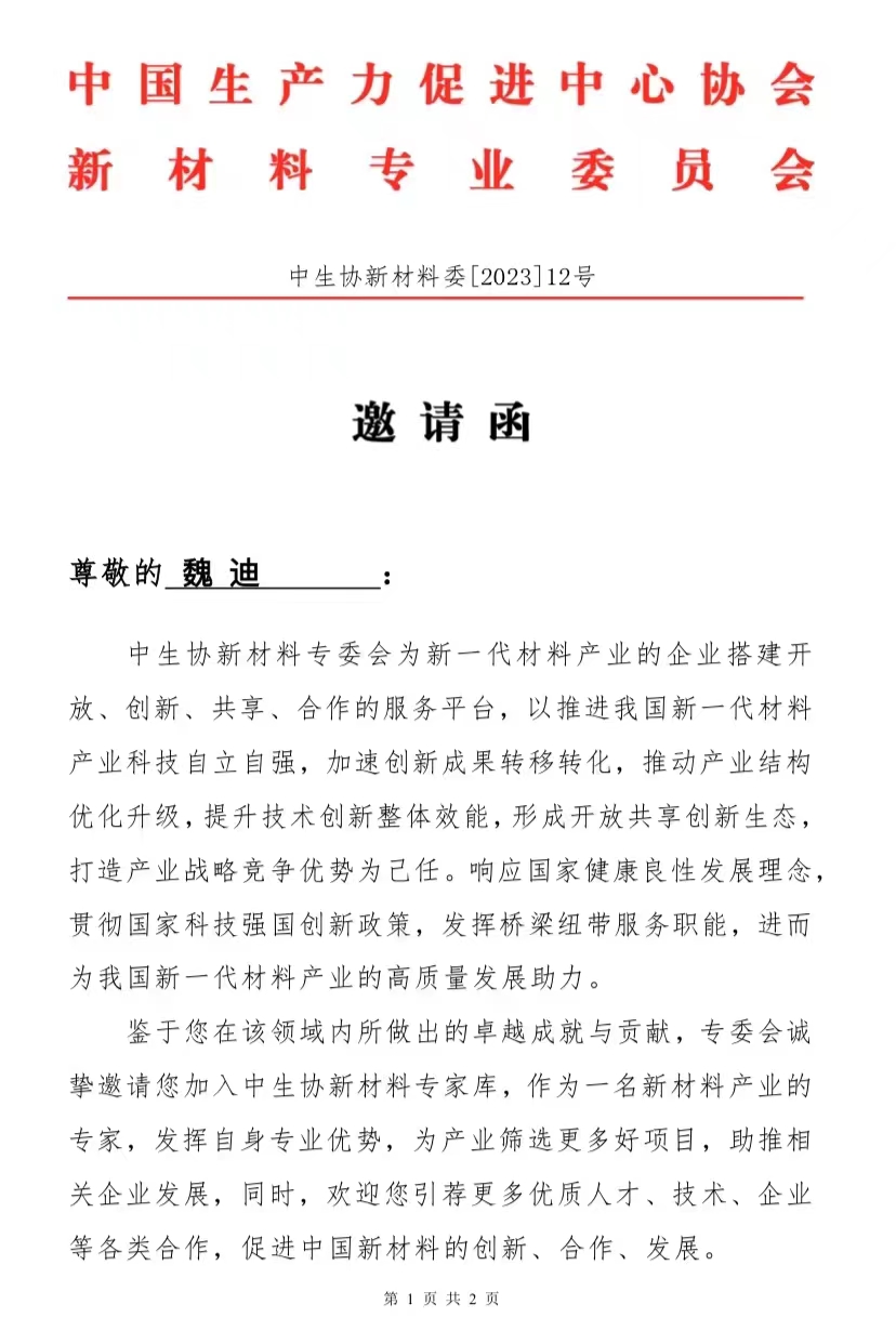 2023年8月12日,魏迪教授应邀加入中国生产力促进中心协会新材料专家库。作为一名新材产业的专家,魏迪老师将发挥自身专业优势,为产业筛选更多好的项目,助推相关企业的发展。