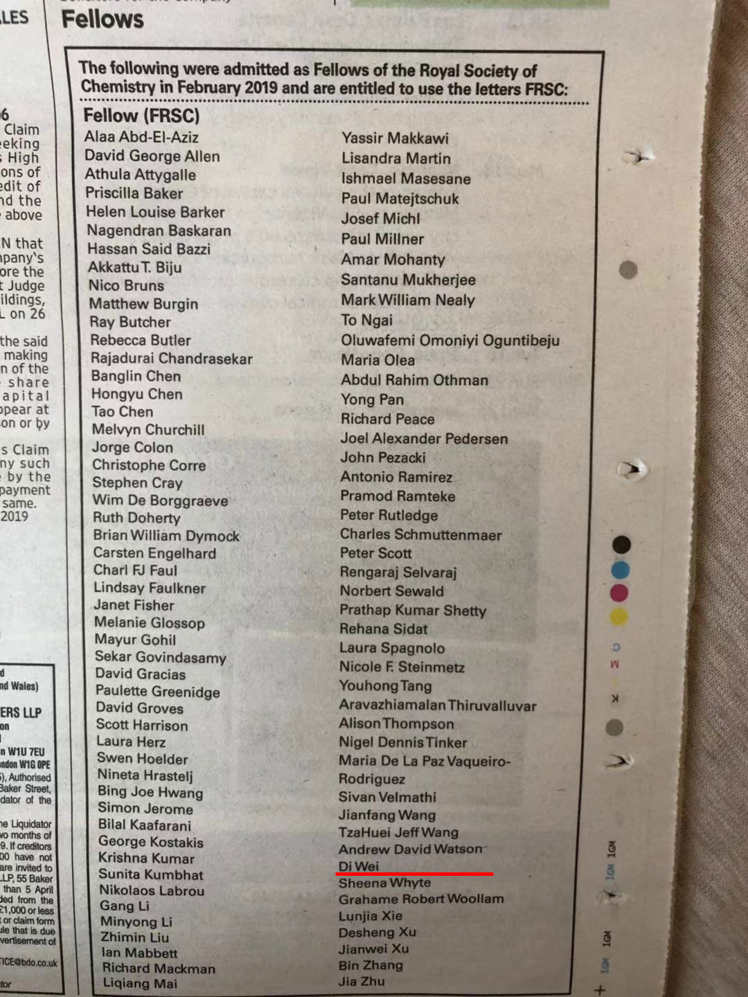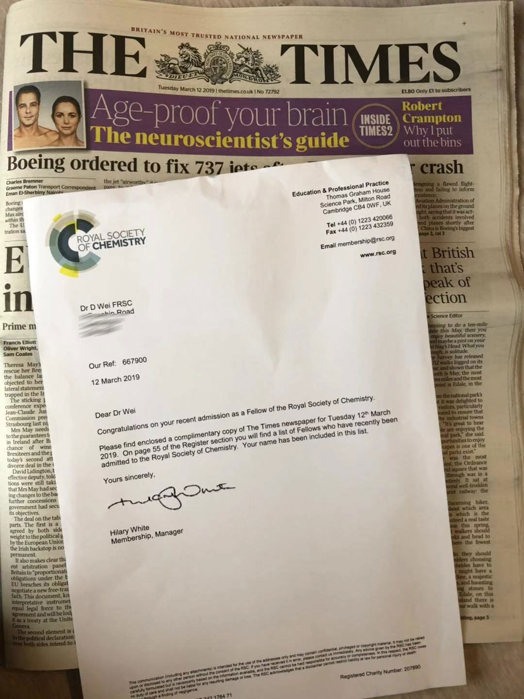 英国《泰晤士报》报道魏迪教授荣获英国皇家化学会会士(FRSC)称号