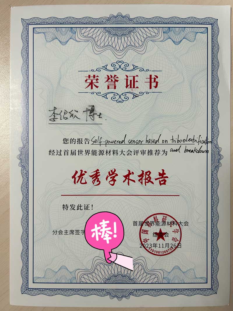 2023年11月25-27日,中国科创之城深圳迎来全球能源材料领域的一场顶级学术盛会——由中国材料研究学会、欧洲材料研究学会联合发起主办的首届世界能源材料大会暨国际能源材料展览会在深圳会展中心隆重举行。课题组博士后-李绍欣博士荣获首届世界能源材料大会优秀学术报告。