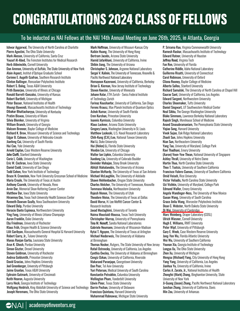 美国东部时间2024年12月10日,美国国家发明家科学院(National Academy of Inventors, NAI)公布了2024年度当选该院院士(NAI Fellow)的名单,魏迪教授当选为美国国家发明家科学院院士(FNAI)。