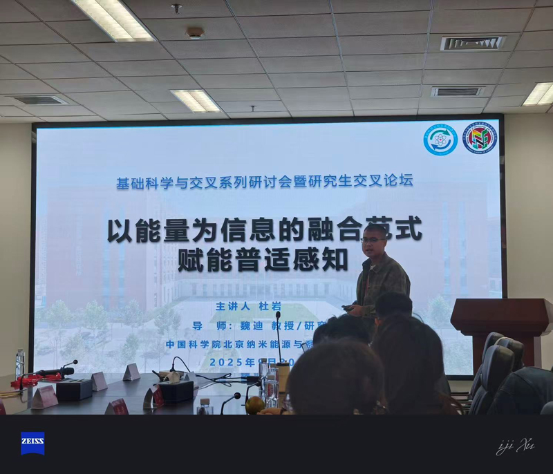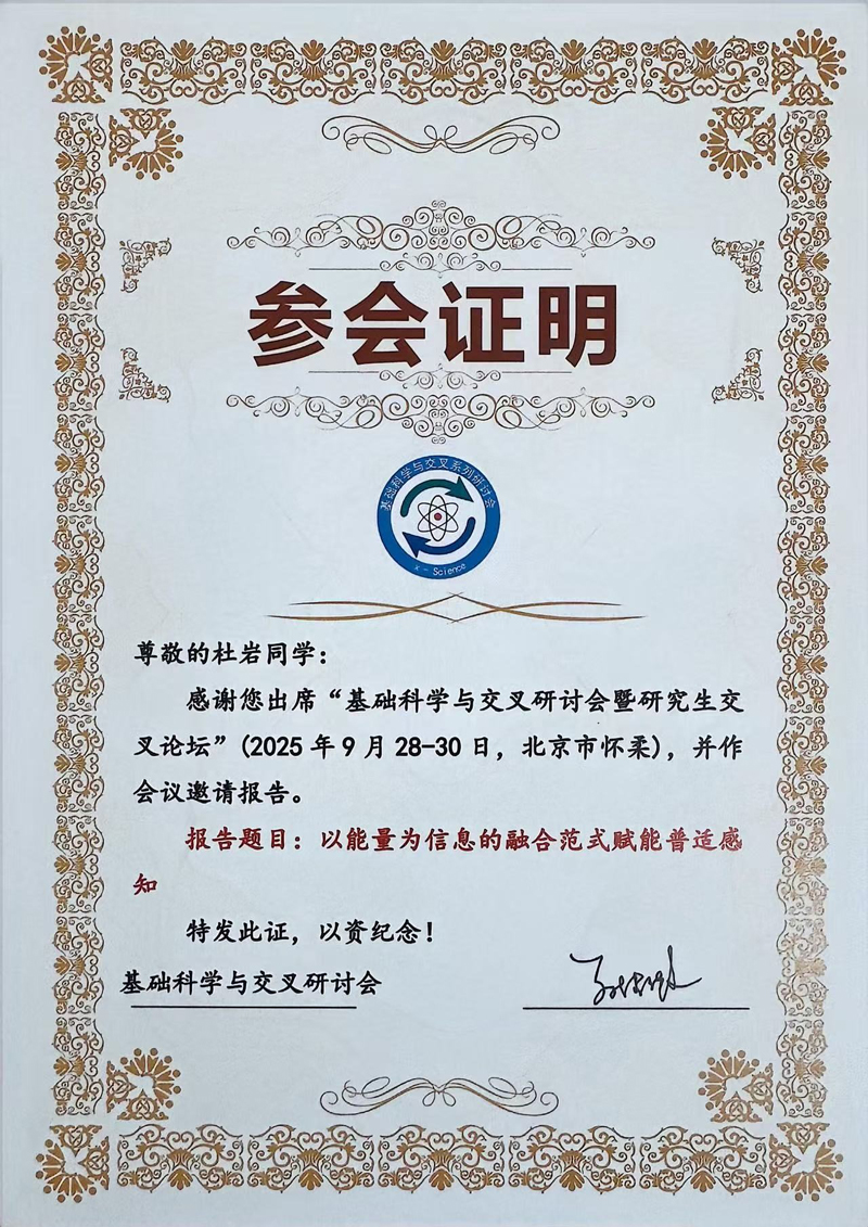 2025年9月28日-30日,“基础科学与交叉系列研讨会”在北京怀柔纳米能源与系统研究所召开,课题组博士研究生——杜岩应邀参加,并做了题为《以能量为信息的融合范式赋能普适感知》的学术报告,受到了与会专家和同仁的关注与好评。
