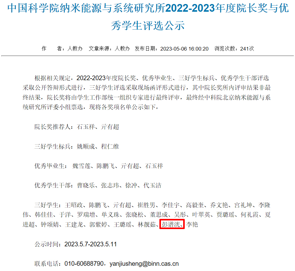 2023年5月6日,课题组博士生-彭谱洸荣获所2022-2023年度优秀学生。