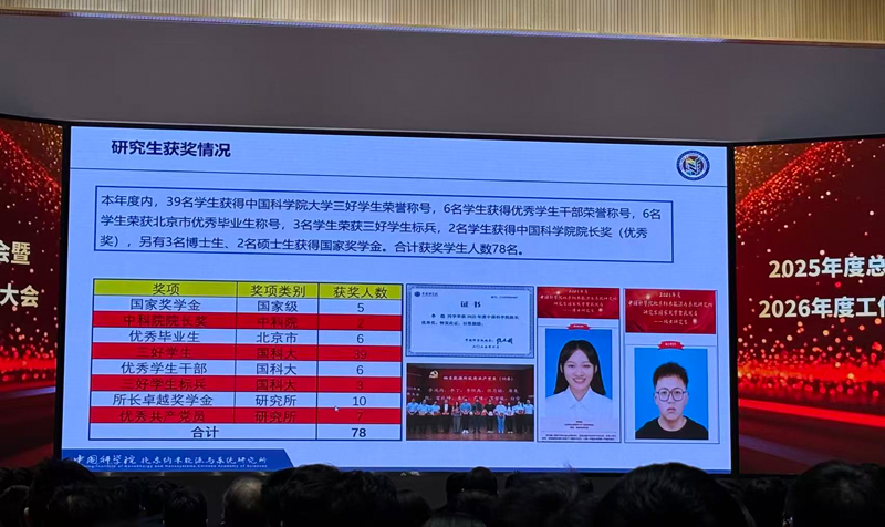 在大会表彰环节,理事长李玉良院士、国科大党委副书记肖作敏、理事会理事肖立业、王中林所长、吴剑锋书记等领导,为2025年度获得先进工作者称号的职工、课题组和获得所长卓越奖学金的学生,颁发了奖杯、奖旗和证书。课题组博士后李想荣获2025年度中国科学院院长优秀奖,课题组博士研究生杜岩荣获2025年度研究生国家奖学金,硕士研究生魏雨荣获2025年度研究生国家奖学金,硕士研究生钱汉荣获2024-2025学年“所长卓越”奖学金。